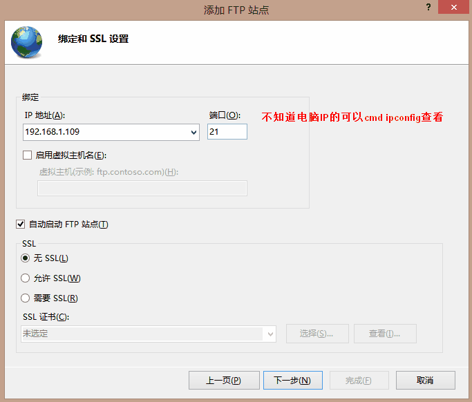 IP設置為本機的IP地址,端口用FTP默認的21,SSL勾選“無”,點擊“下一步”,出現“綁定SSH設置”界面。