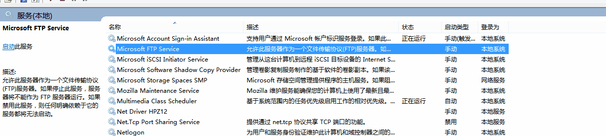 提示:除非 Microsoft FTP 服務(FTPSVC)正在運行,否則無法啟動 FTP 站點。服務目前已停止。