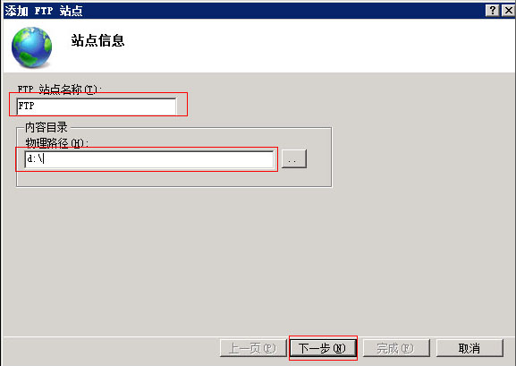 3.填寫FTP站點名稱及所在盤符,這個盤符比較講究,如果是在D盤設為FTP目錄那么只要選擇D盤就可以。