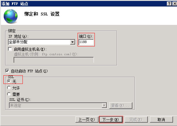 5.一般情況下IP地址不用選擇,除非特殊要求,端口號就改成自己喜歡的,SSL可以選擇無。