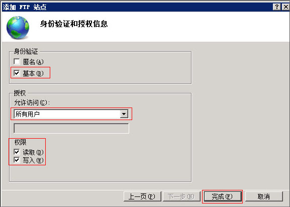 6.這里比較關鍵,身份驗證這里選擇“基本”即可,允許訪問這里選擇“所有用戶”,并且權限這里要勾上“讀取,寫入”