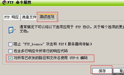 步驟4:點擊“全局屬性。。?!焙髸棾鋈謱傩栽O置窗口,我們選擇“高級選項”就可以在這里看到編碼的設置。Serv-u 7默認是使用UTF-8編碼,我們將“對所有已收發的路徑和文件名使用UTF-8編碼”前的鉤去掉就解決了Serv-u 7下中文名無法刪除問題及偶爾出現的亂碼問題。