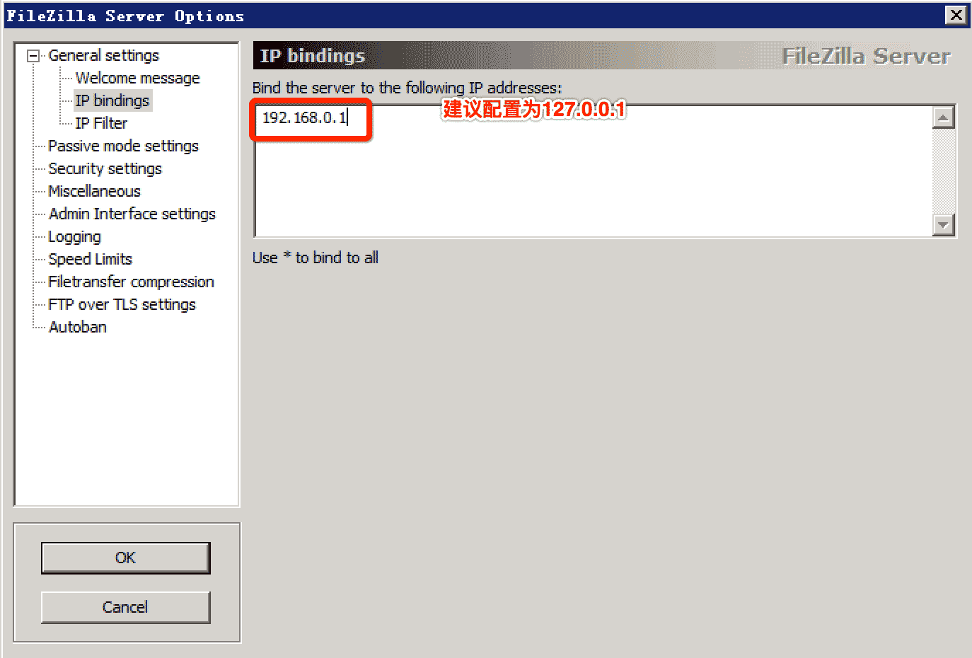 注意:本文提到的大部分配置都是通過 FileZilla 服務器的 Edit > Settings > FileZilla Server Options 菜單來實現的。