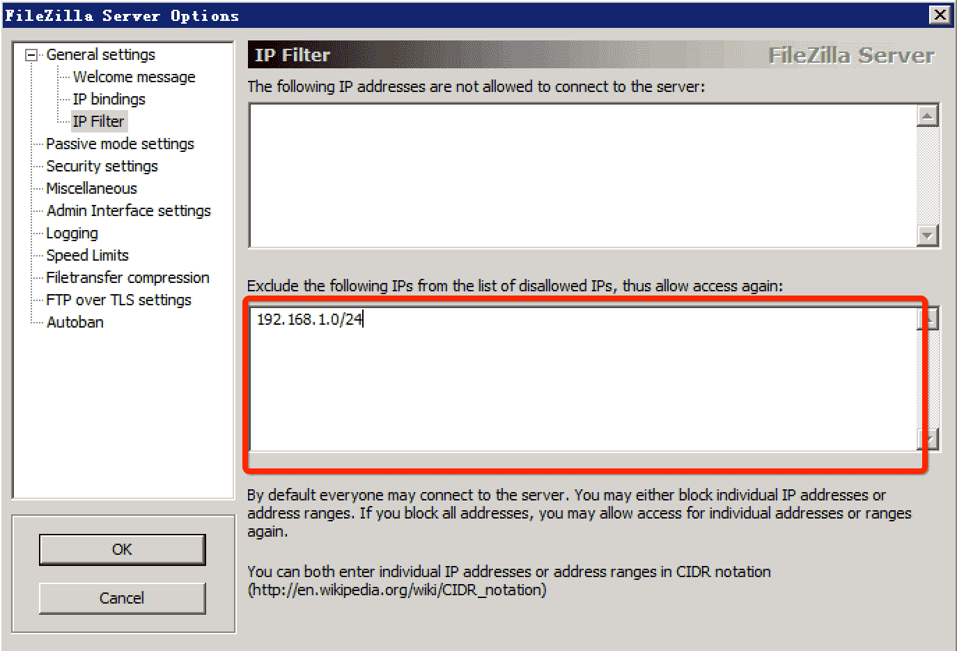 注意:通常采用阻止所有 IP(填寫 *),然后僅允許部分 IP 的方式來進行有效的限制。例如,下圖中僅允許 192.168.1.0/24 網段訪問 FTP 服務。
