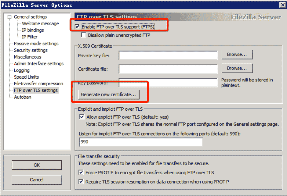 FileZilla 服務器支持 TLS 加密功能,用戶如果沒有證書可以使用自帶功能來創建。