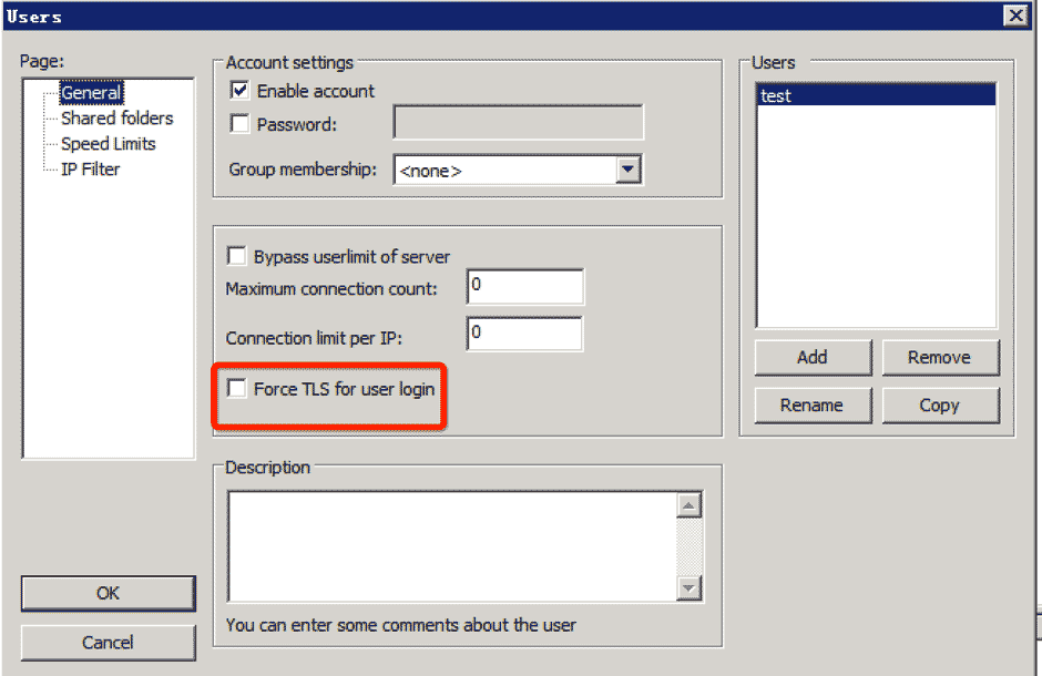 FileZilla 服務器未提供限制密碼復雜度的選項,且服務器用戶是由管理員通過管理接口來添加的,用戶也無法通過 FTP 命令來修改密碼。因此,建議管理員在添加用戶時為用戶配置復雜的密碼。
