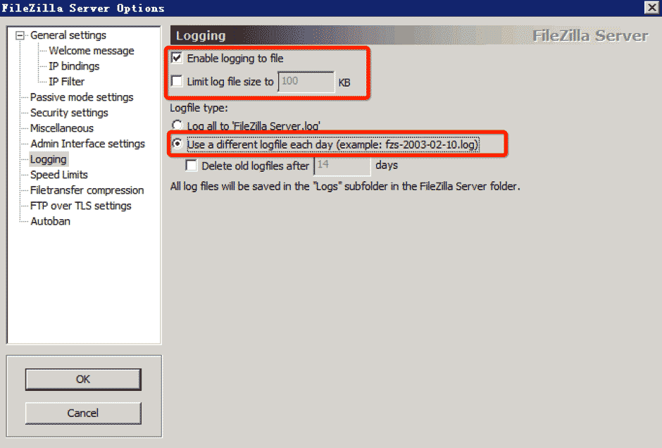 FileZilla 服務器默認未開啟日志記錄,為了方便對各種事件的追查,建議開啟日志記錄功能,并將日志設置為每天一個日志文件,避免單文件過大。