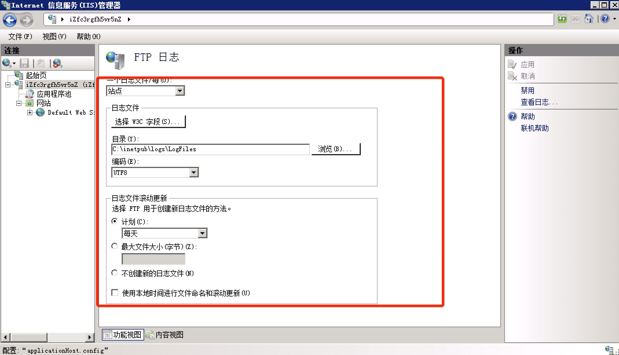 IIS 中的 FTP 日志是默認啟用的,您可以根據磁盤空間情況配置日志空間大小和其他策略。