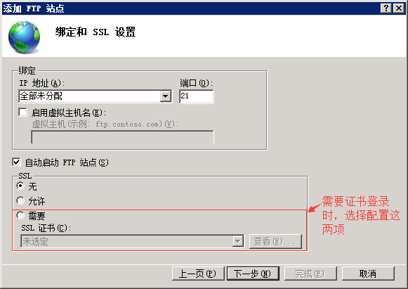 6、點擊下一步,配置綁定和SSL設(shè)置信息,如圖: