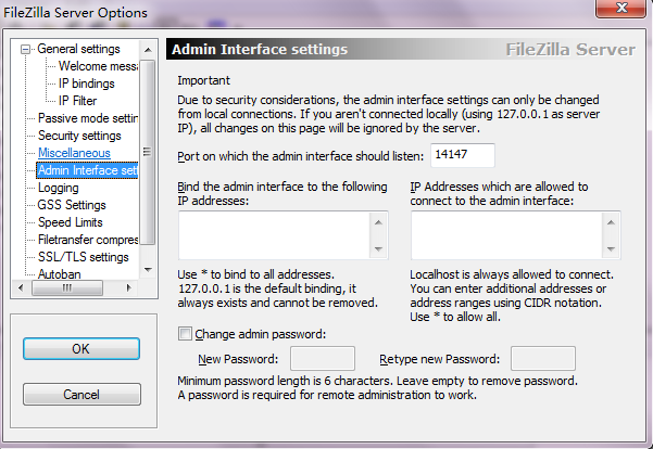 注意:修改端口和密碼非常重要,這是確保Filezilla安全的重點,必須修改端口,必須設置密碼!密碼建議足夠復雜!可以在管理界面中進行修改