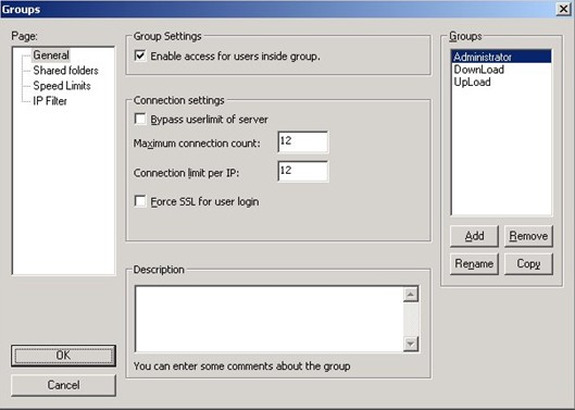 組設置中的“Speed Limits”和“IP Filter”跟全局設置里面的速度限制和IP過濾器設置方法是一樣的,請參照前面的內容。只不過這個是僅僅針對這個組的用戶生效。而全局設置是對所有的用戶都生效。設置完畢之后點擊“OK”按鈕回到主界面。