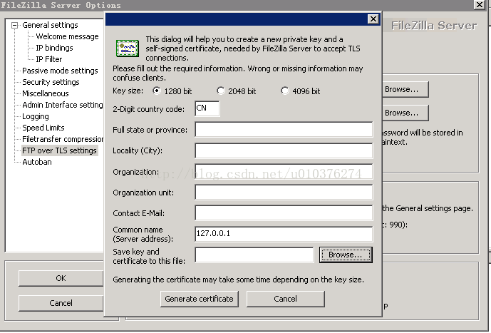 選FTP over TLS settings,勾選Enable FTP over TLS support,然后點擊中間Generate new certificate...按鈕