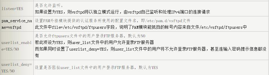 userlist_deny=YES/NO(YES) //決定vsftpd.user_list文件中的用戶是否能夠訪問FTP服務器。若設置為YES,則vsftpd.user_list文件中的用戶不允許訪問FTP,若設置為NO,則只有vsftpd.user_list文件中的用戶才能訪問FTP。