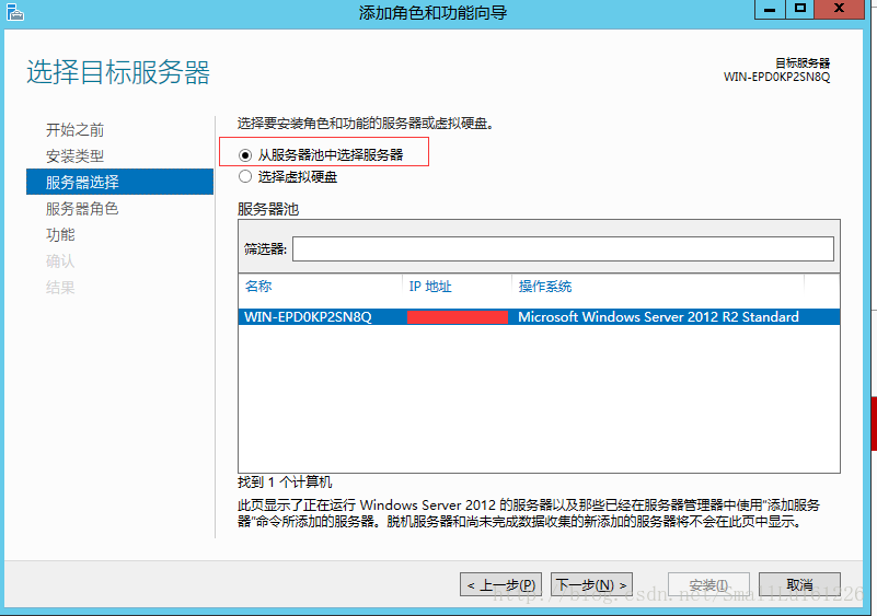 2.在添加角色和功能向導里,選擇 從服務器池中選擇服務器
