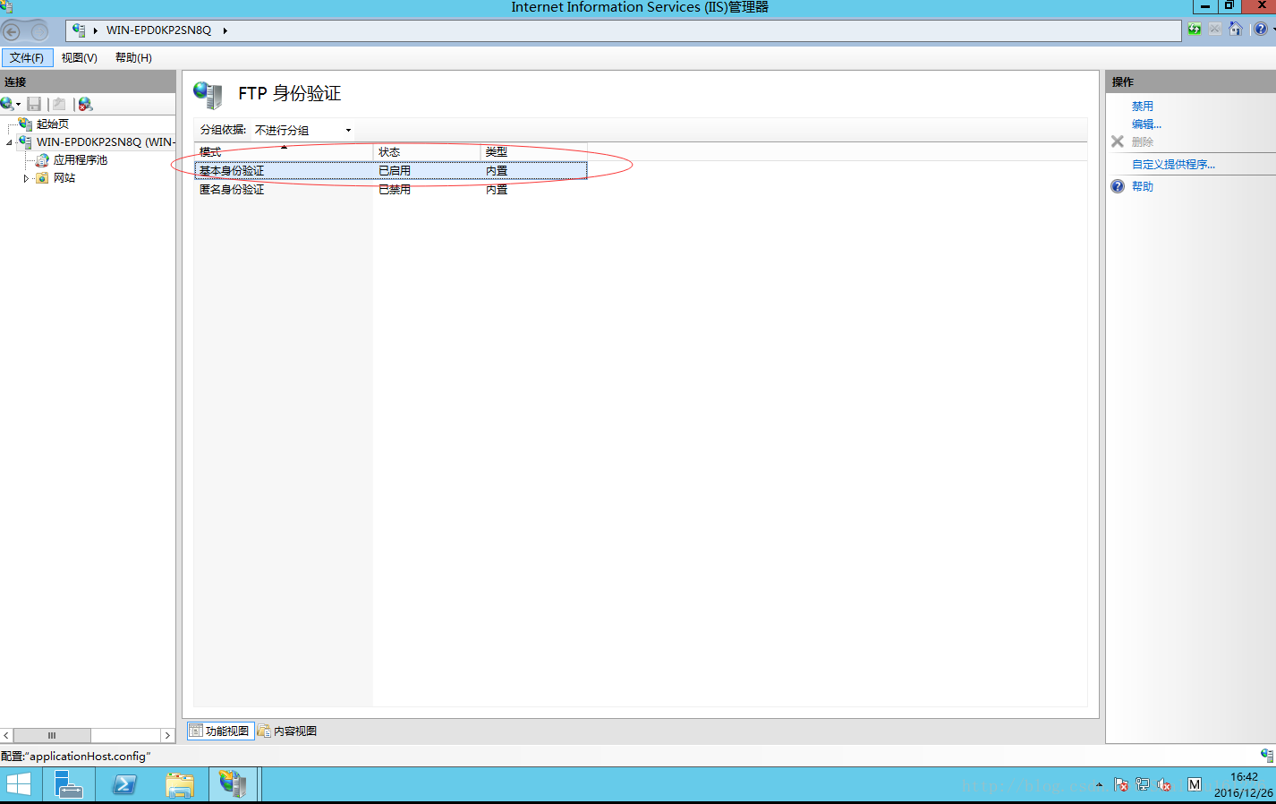 6.FTP界面上選擇“FTP身份驗證”——>“基本身份驗證”–>”啟用”