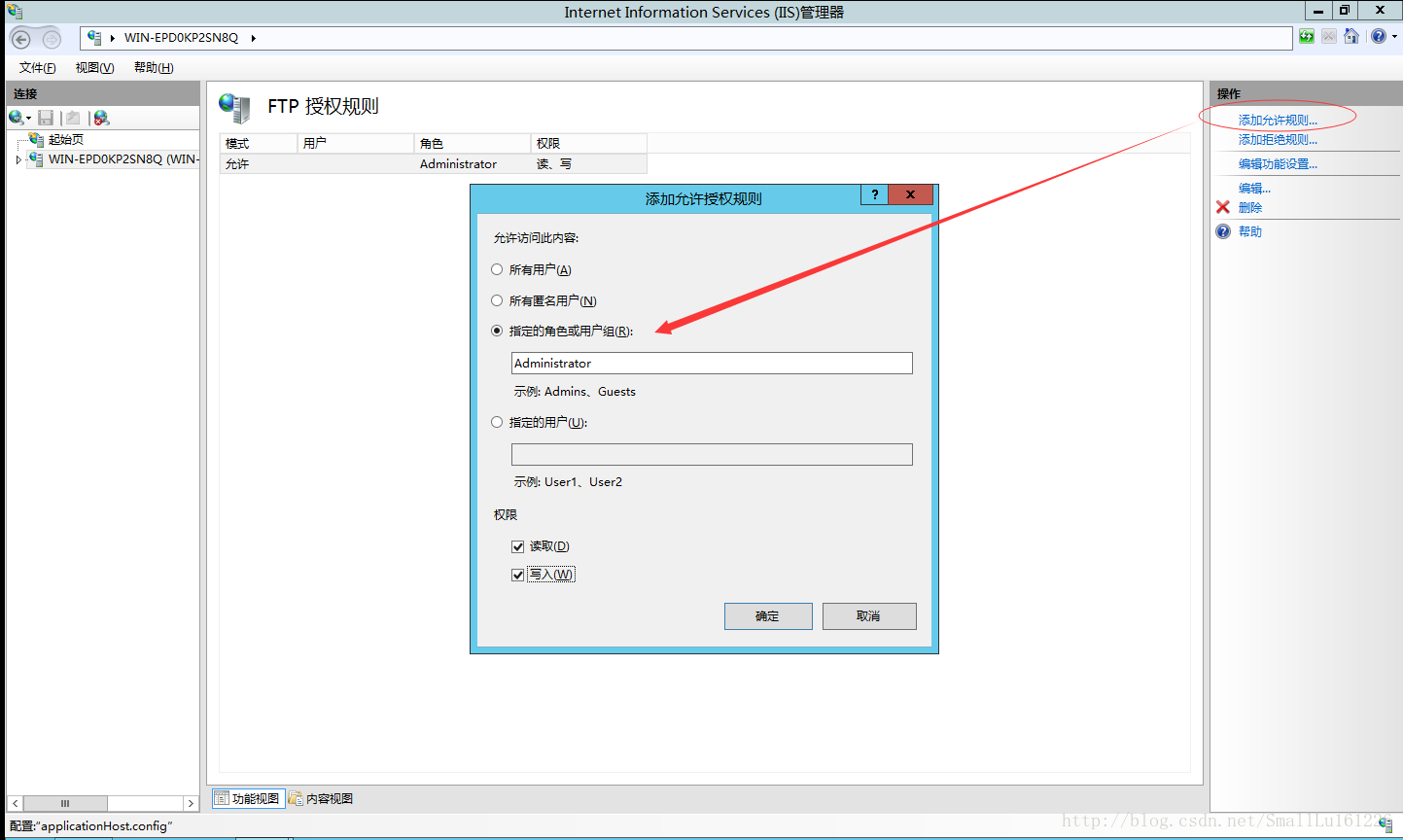 7.FTP界面選擇 “FTP授權規(guī)則“—>右側“添加允許規(guī)則”–>選擇“指定的角色或用戶組”,以及權限選擇,“讀取 寫入”