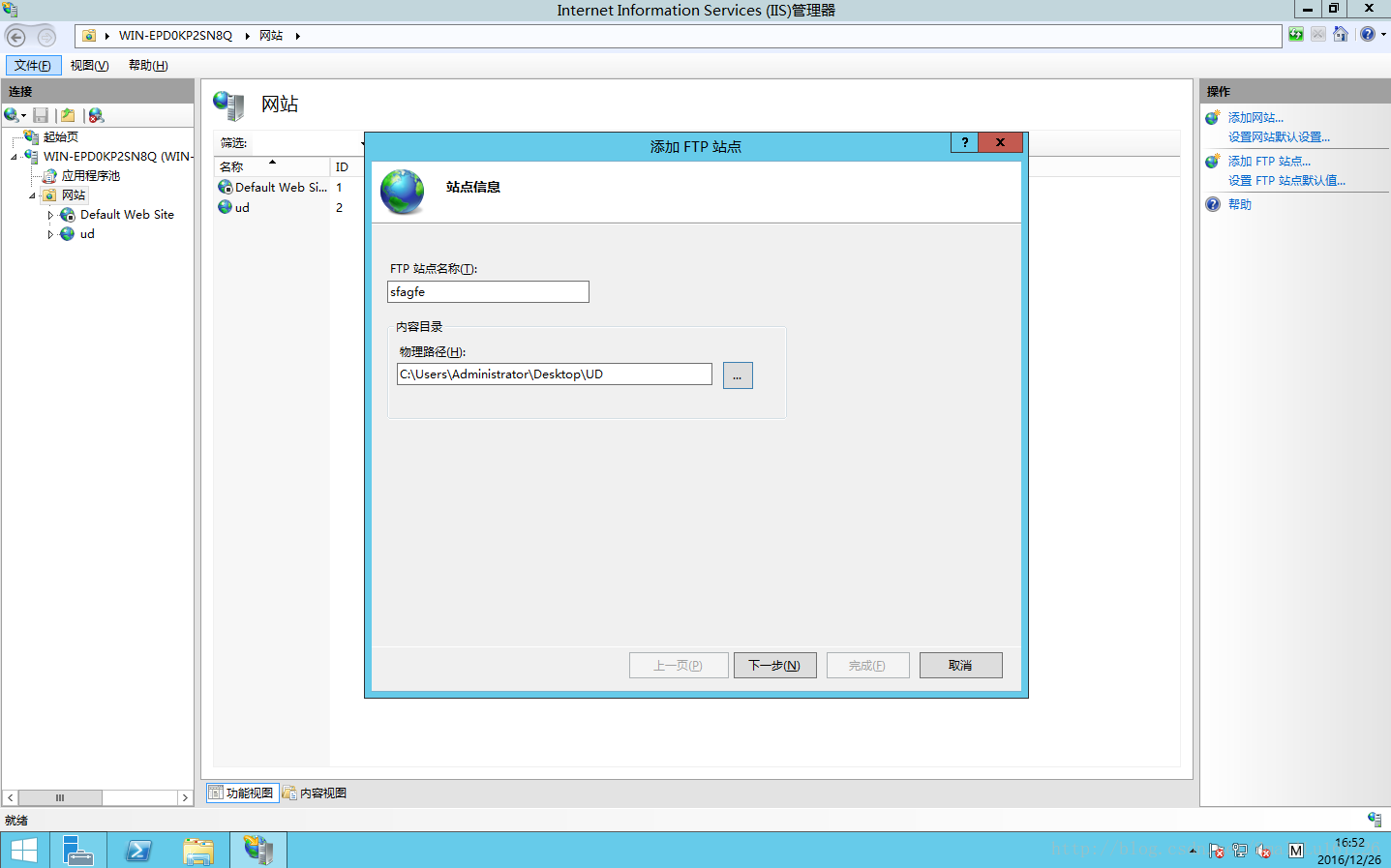 8.完成所有前戲后,接下來就開始進行建立FTP網站,點擊IIS管理器界面 “網站”,點擊右側添加“FTP站點”,FTP站點名稱可以任意取,內容目錄為服務器上提供上傳、下載文件保存目錄。