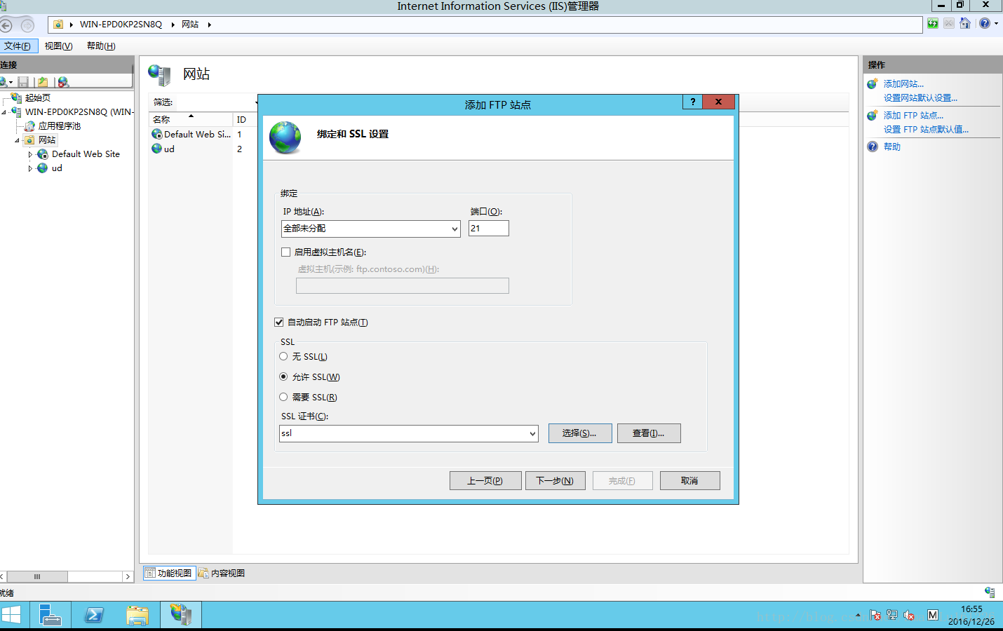 8.1.點擊“下一步”綁定IP可以選取指定IP,也可以默認,端口號默認21,勾選下面“自動啟動FTP站點”導入剛才建立的SSL證書