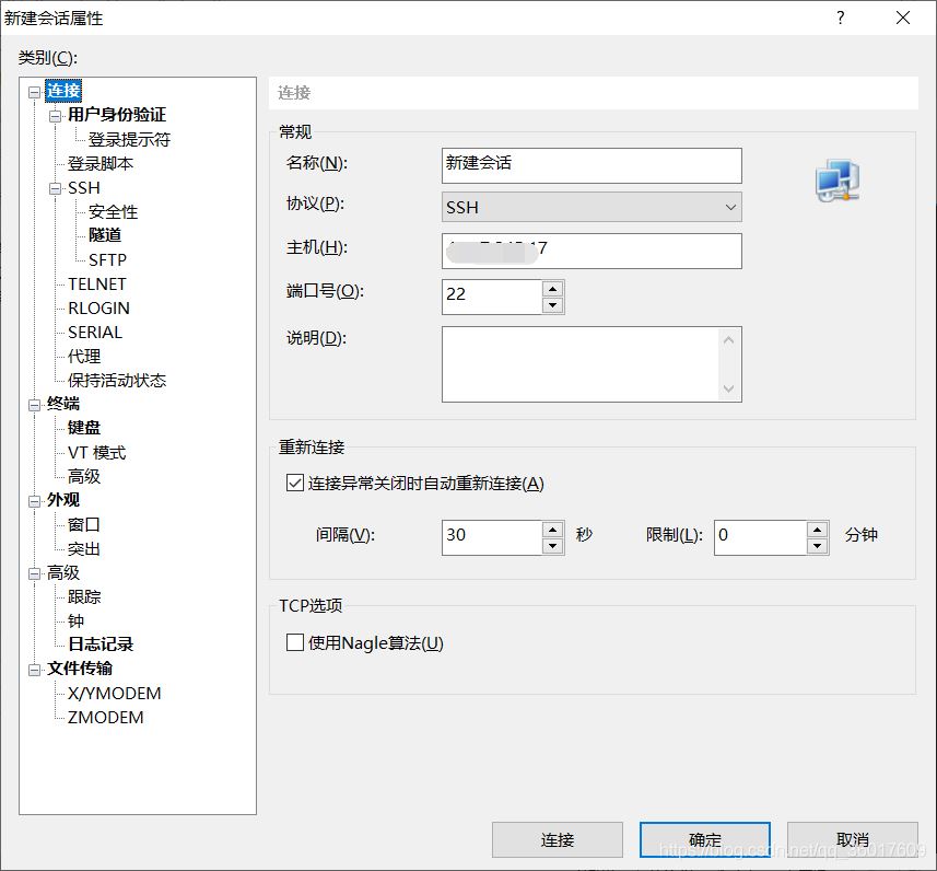 新建會(huì)話,并在連接中輸入會(huì)話名稱、主機(jī)(服務(wù)器外網(wǎng)IP地址)、端口號(22)、勾選重新連接選擇30秒