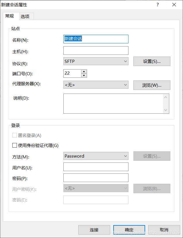 新建會(huì)話,輸入主機(jī)(服務(wù)器外網(wǎng)IP地址)、協(xié)議選擇SFTP、端口號22、勾選身份驗(yàn)證代理并輸入用戶名和密碼