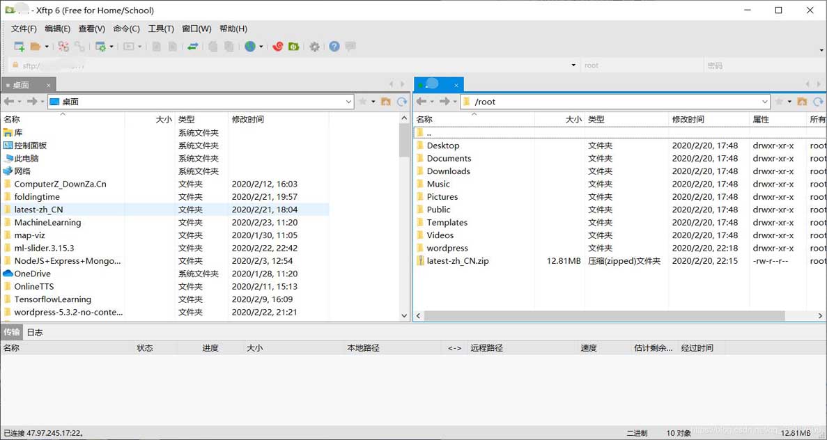 點(diǎn)擊連接即可在右側(cè)窗口查看遠(yuǎn)程服務(wù)器的文件,上傳下載直接通過拖動(dòng)即可實(shí)現(xiàn)。左側(cè)為自己本機(jī)的文件。