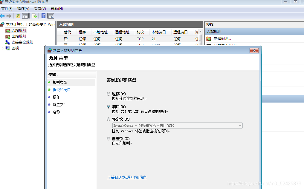 快捷鍵“win+r”打開“運行”,輸入“WF.msc”進入防火墻安全設置,點擊“入站規則”點擊“新建規則”,“規則類型”選擇“端口”