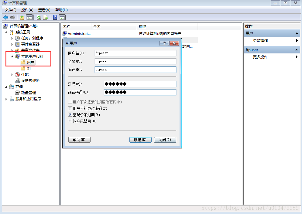 5.配置ftp賬號,計算機-》右鍵,管理(為保證用戶添加成功,需要重啟電腦)