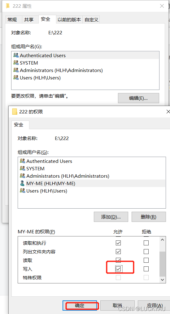 然后點擊確定、確定,回到 以下界面,勾選寫入權限,點擊確定