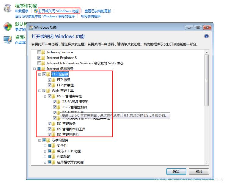 1. 首先開啟ftp功能:控制面板->程序->程序和功能->打開或關閉Windows功能,將FTP功能勾選