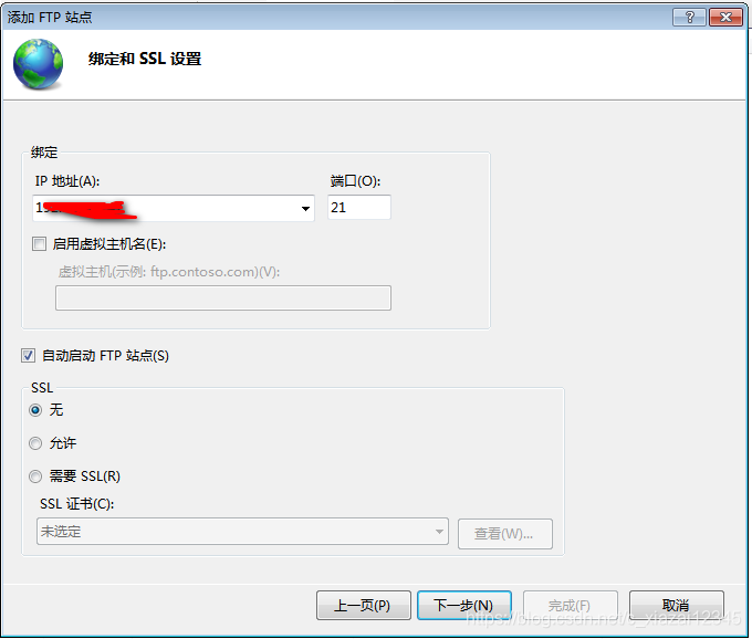 2.4 ip地址輸入本機地址,端口默認為21,可更改,ssl選擇無,點擊下一步