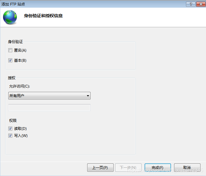 2.5 設置身份驗證為基本,權限讀取、寫入,允許訪問為所有用戶,點擊完成。ftp站點已添加完成,可進行登錄測試。