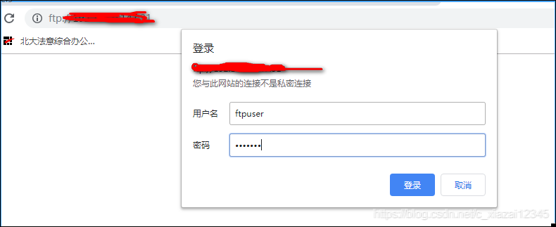 3. 登錄測試:打開谷歌瀏覽器,輸入ftp://ip地址:端口號,彈出密碼頁,輸入當前電腦的登錄用戶和密碼即可訪問ftp文件夾