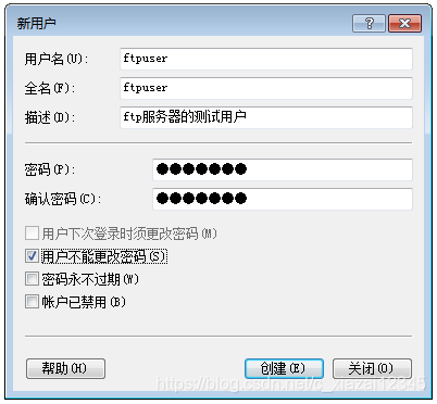 4. 輸入用戶名、全名、密碼、確認密碼、勾選用戶不能更改密碼,點擊創(chuàng)建