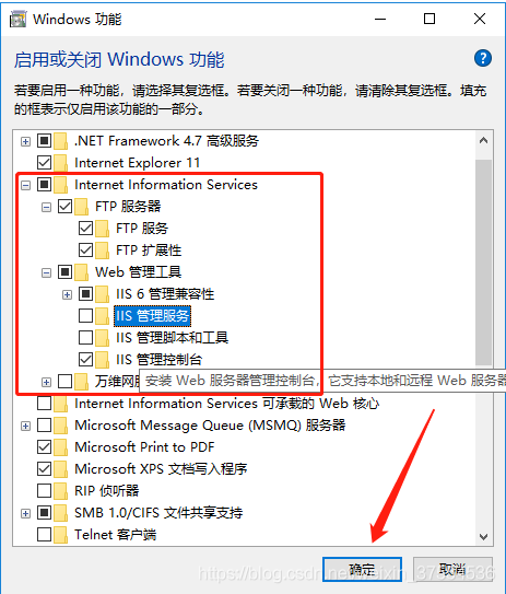 四:在“windows功能”中找到“Internet Information Service ( Internet信息服務 )”,并選中“FTP服務”、“FTP擴展性”和“IIS管理控制臺”前的復選框,點擊“確定”;