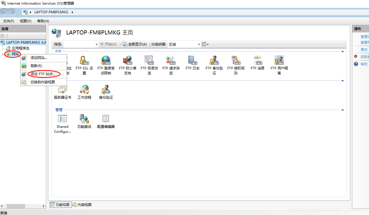 六:在Internet Information Service(IIS)管理器窗口右側,右擊“網站”,點擊“添加FTP站點”,打開;