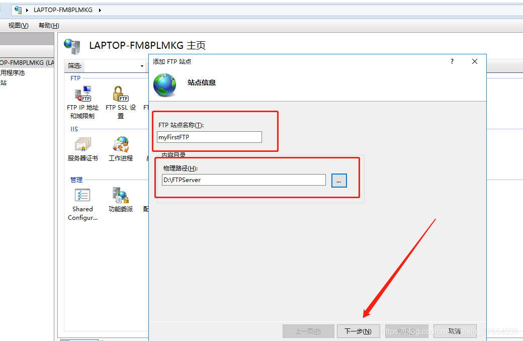 七:填寫“FTP站點名稱”和“物理路徑”,點擊下一步;