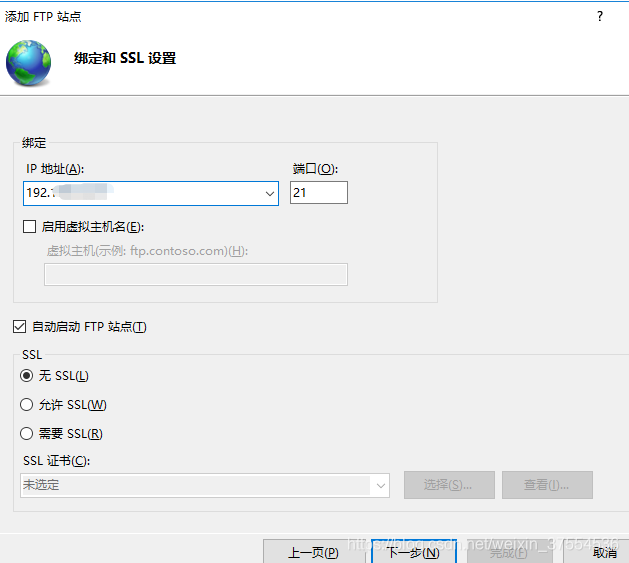八:設置“綁定和SSL設置”,在“IP地址”處,可以用內網IP也可以用外網IP,訪客自然也就根據你的IP設定來決定,點擊下一步;