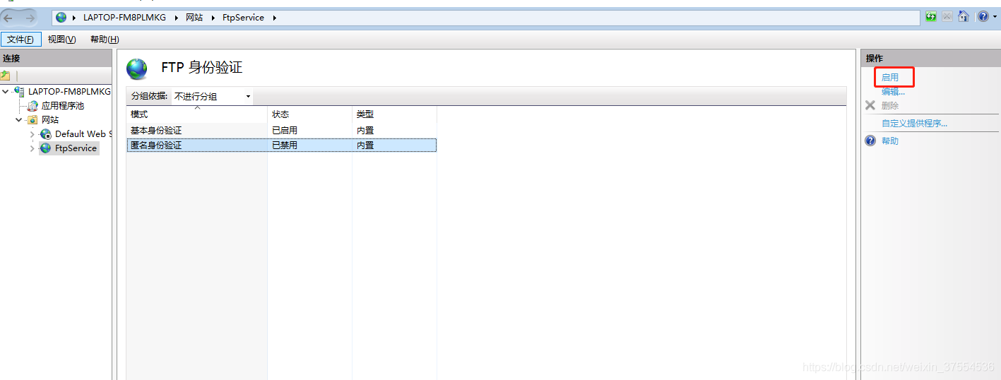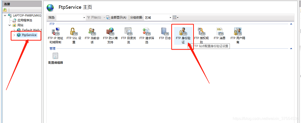 十一:打開Internet Information Service(IIS)管理器窗口,點擊自己之前創建的FTP站點,點擊,在左側窗口內找到“FTP身份驗證”,雙擊進入;
