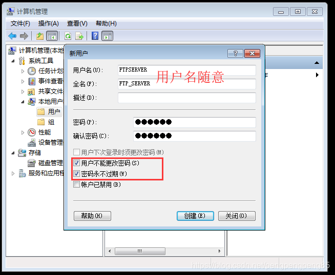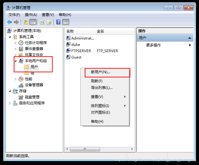 1.創(chuàng)建用于登陸ftp的用戶:打開計(jì)算機(jī)管理程序,依次點(diǎn)擊左側(cè)本地用戶組–>用戶,右側(cè)空白處右擊點(diǎn)擊“新用戶”。