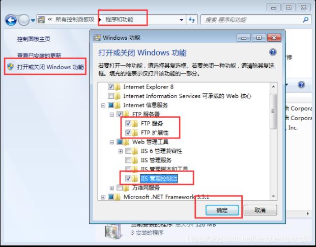 3.控制面板中找到程序和功能,在左側(cè)的菜單點(diǎn)擊“打開或關(guān)閉Windows功能”,在彈窗的窗口中勾選FTP服務(wù)、FTP擴(kuò)展性、IIS管理控制臺,只需要勾選途中框起來的3個即可,確定后等待幾分鐘即可完成,部分設(shè)備可能需要重新啟動計(jì)算機(jī)。