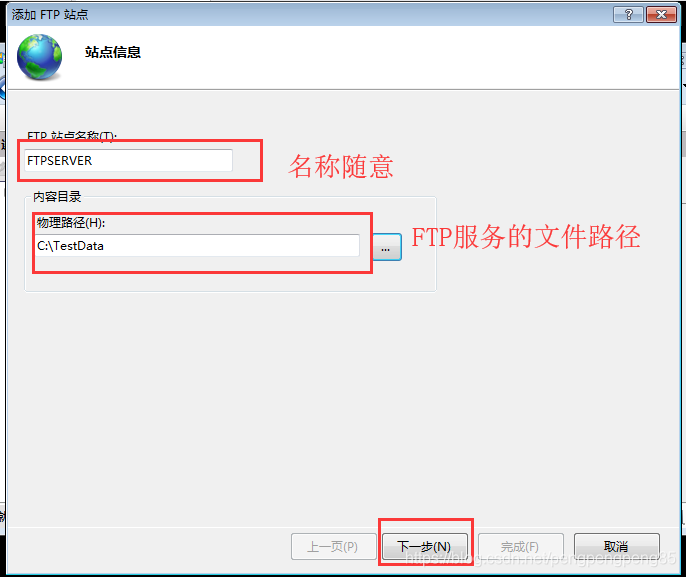 7.錄入站點(diǎn)名稱,和需要映射FTP服務(wù)的文件路徑。