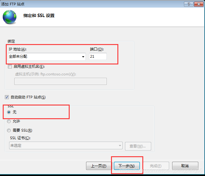 8.IP地址默認(rèn)全部未分配即可,端口號默認(rèn)21,SSL這里選無。