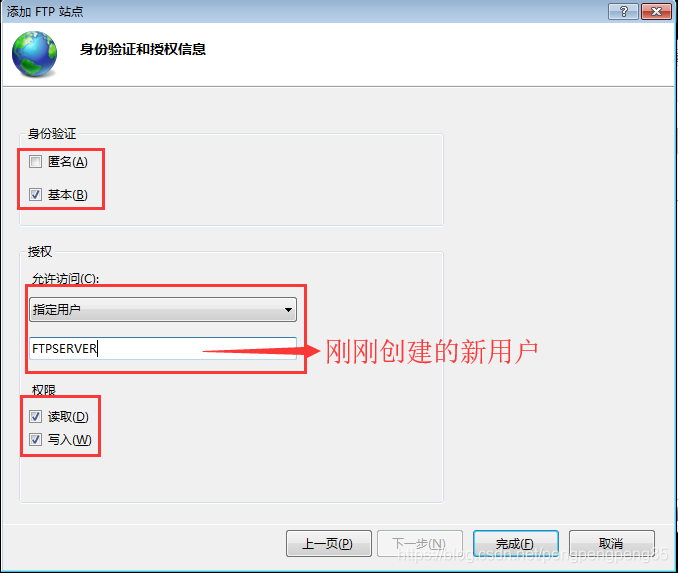 9.因?yàn)槲乙驠TP服務(wù)只能通過新建的用戶登入,所以身份驗(yàn)證選基本,授權(quán)這里指定剛剛創(chuàng)建的用戶。