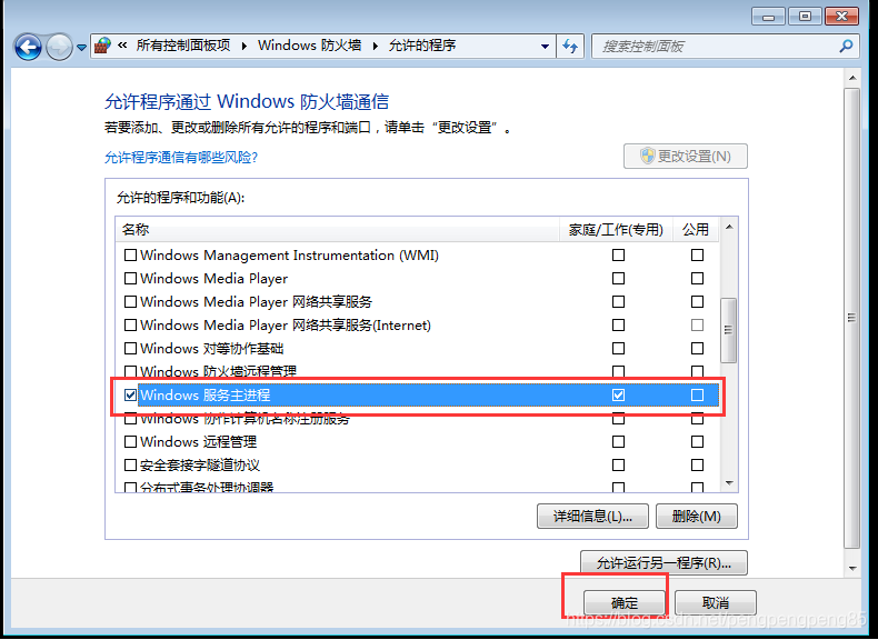 此時(shí)多了一個多出一項(xiàng)“Windows服務(wù)主進(jìn)程”,勾選后面的兩個復(fù)選框,完成后確認(rèn)。