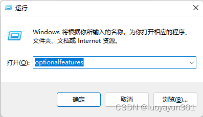 打開運(yùn)行窗口【win+R】快捷鍵,輸入 optionalfeatures 后點(diǎn)擊確定:
