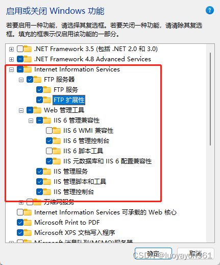在彈窗中找到 Internet信息服務(wù),并打開勾選以下配置 點(diǎn)擊確定