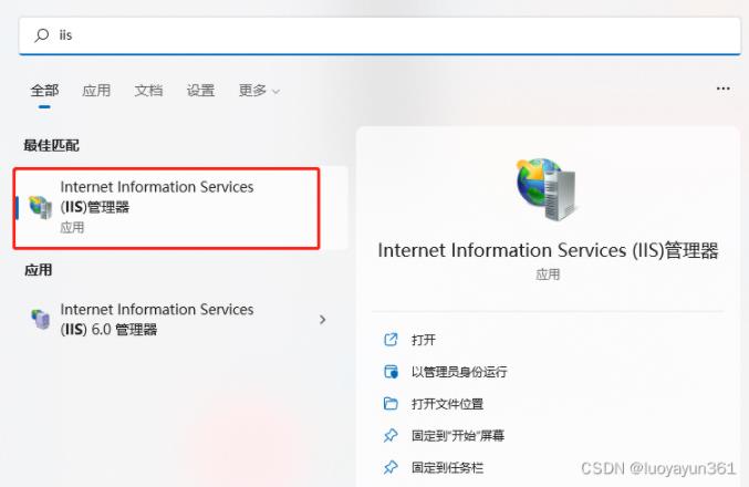 接下來 在開始欄中搜索 IIS 并點(diǎn)擊進(jìn)入IIS管理器