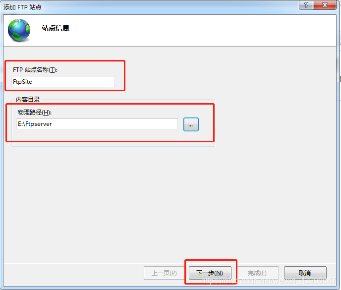 2.2.4 配置網站(網站名稱:FtpSite 物理路徑:E:\ftpserver 本機IP地址(從下拉菜單選擇):192.168.43.147)