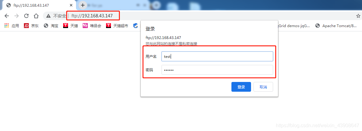 3.1 瀏覽器或者文件管理器地址欄輸入ftp地址(ftp://192.168.43.147),輸入用戶名和密碼。