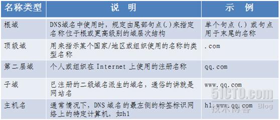 按其功能命名空間中用來描述 DNS 域名稱的五個類別的介紹詳見下表中,以及與每個名稱類型的示例。